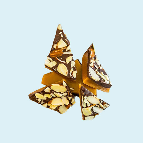 A buttery, almond flavored toffee, topped with dark chocolate & sprinkled with roasted almonds.